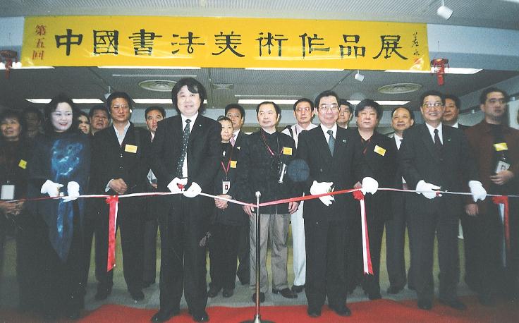 中国书法美术代表团团长张杰、中国驻日本大使馆文化参赞耿墨学、日中文化协会理事长上山卓司等为第五届中国书法美术作品展开幕式剪彩。