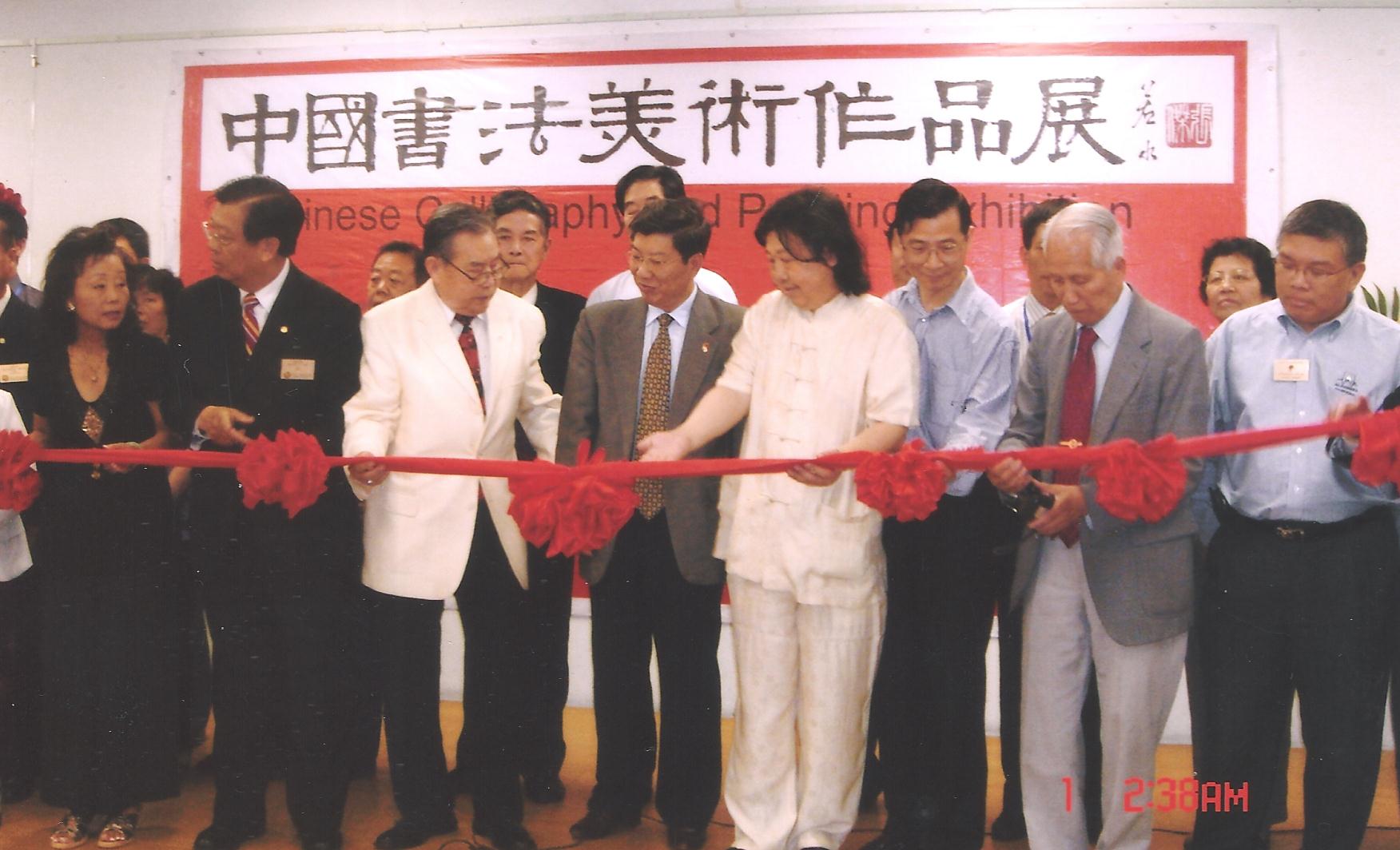 中国书法美术作品展美国洛杉矶展开幕式剪彩。